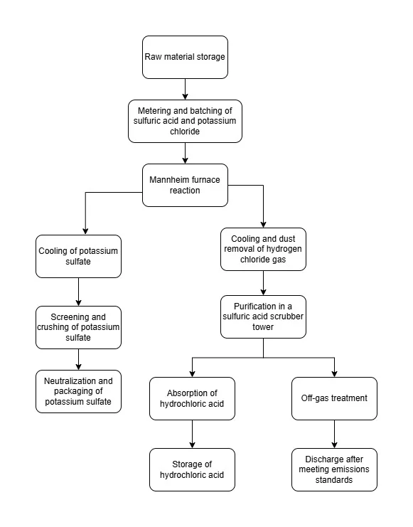يستخدم خط إنتاج سماد كبريتات البوتاسيوم عملية مانهايم، وهي إحدى الطرق الشائعة والموثوقة لإنتاج كبريتات البوتاسيوم عالية الجودة. وبصفته سماد بوتاسيوم متميز وخالٍ من الكلور، يلعب كبريتات البوتاسيوم دوراً حيوياً في تحسين جودة المحاصيل وتعزيز قدرة النباتات على مقاومة الإجهاد. كما يعتمد خط الإنتاج على كلوريد البوتاسيوم وحمض الكبريتيك المركز كمادتين خام أساسيتين، لإنتاج كبريتات البوتاسيوم بكفاءة عالية، بما يلبي متطلبات الاستخدام الزراعي الحديث.